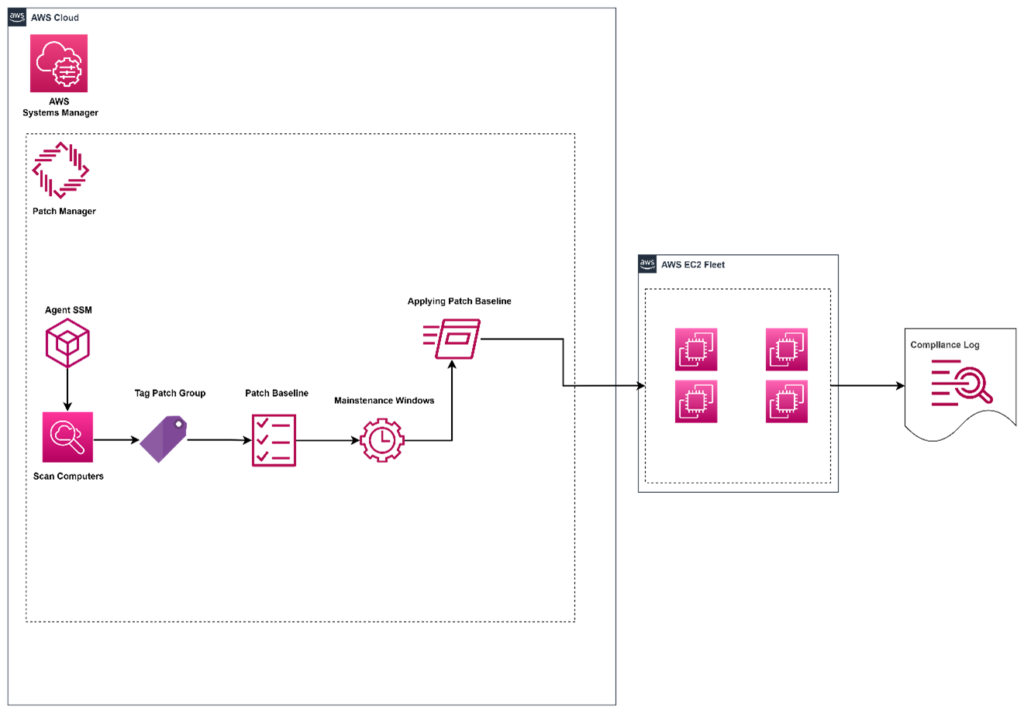 Com o recurso patch manager do AWS System Manager é possível automatizar e aplicar os patches de atualizações através das fontes oficiais e/ou personalizadas em dias e horas pré-agendados de forma segura sem nenhuma intervenção do administrador que pode verificar o êxito das atualizações e logs das instalações salvos no console AWS. A forma com que foi implementada a arquitetura segue abaixo